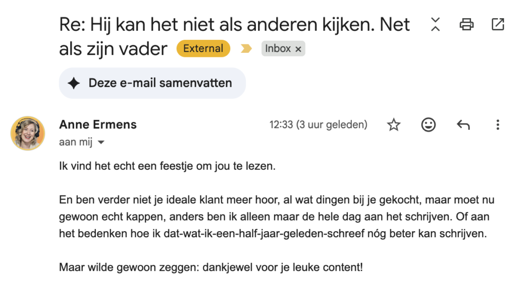 En we sluiten af met de samenvatting van wat je mag verwachten door het lezen van m’n mails. Danielle, hoe zou jij dat omschrijven?
