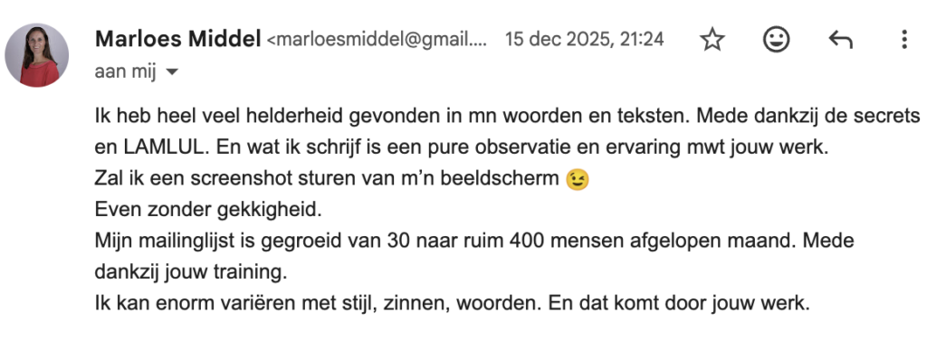 👉 Je gebruikt deze geheimen simpel en snel in elk type tekst, voor jezelf of voor je klanten: sales pages, e-mails, social posts, offertes, web copy – zeg ’t maar.