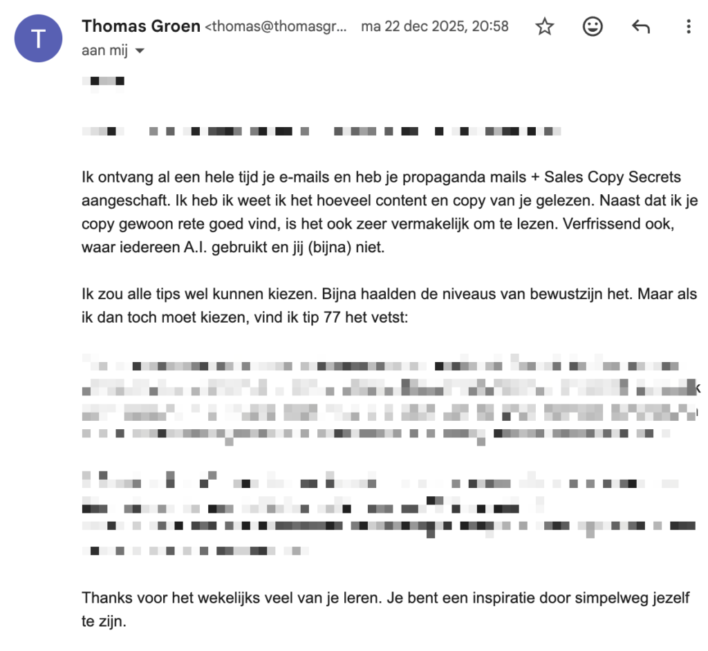 Omdat je nu precies dezelfde geheimen kent als die ik gebruik voor mijn eigen copy, en die van mijn klanten, waarmee ik ondertussen in totaal meerdere miljoenen bij elkaar heb geschreven.